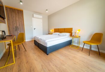 Preferujesz wypoczynek w mieście? Polubisz więc Kurort Kameralny: zlokalizowany na uboczu Mikołajek, dzięki czemu wypoczniesz z dala od miejskiego, letniego gwaru. Na wyciągnięcie ręki masz dodatkowo promenadę Jeziora Mikołajskiego, a także Wioskę Żeglarską (oddalona od obiektu zaledwie o kilka minut spacerem).